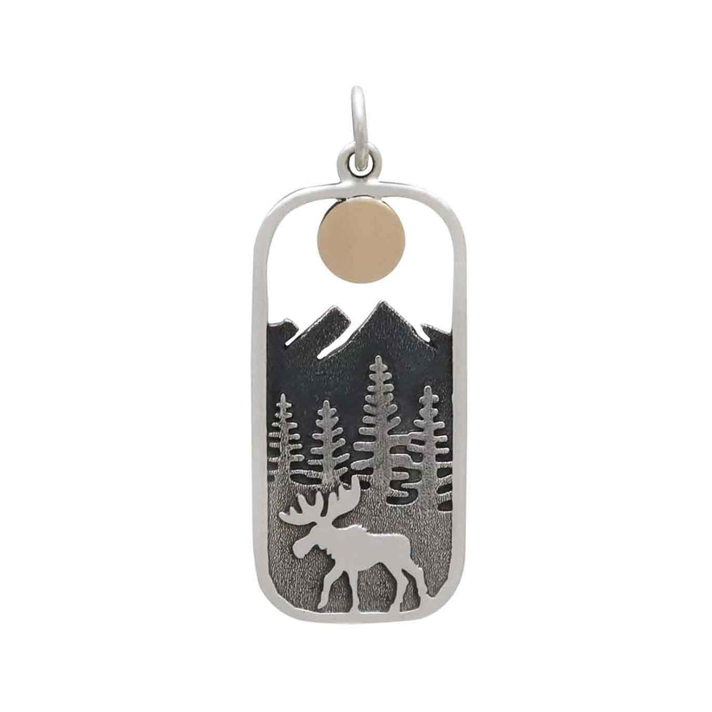 This sterling silver moose pendant with the bronze sun is set in a mountain meadow somewhere dreamy, where the snow blankets the mountains, the trees grow tall, and the rivers run wild. A shy and solo animal, the moose wanders these northernmost forests foraging upon trees and aquatic plants, leading a mostly peaceful life.