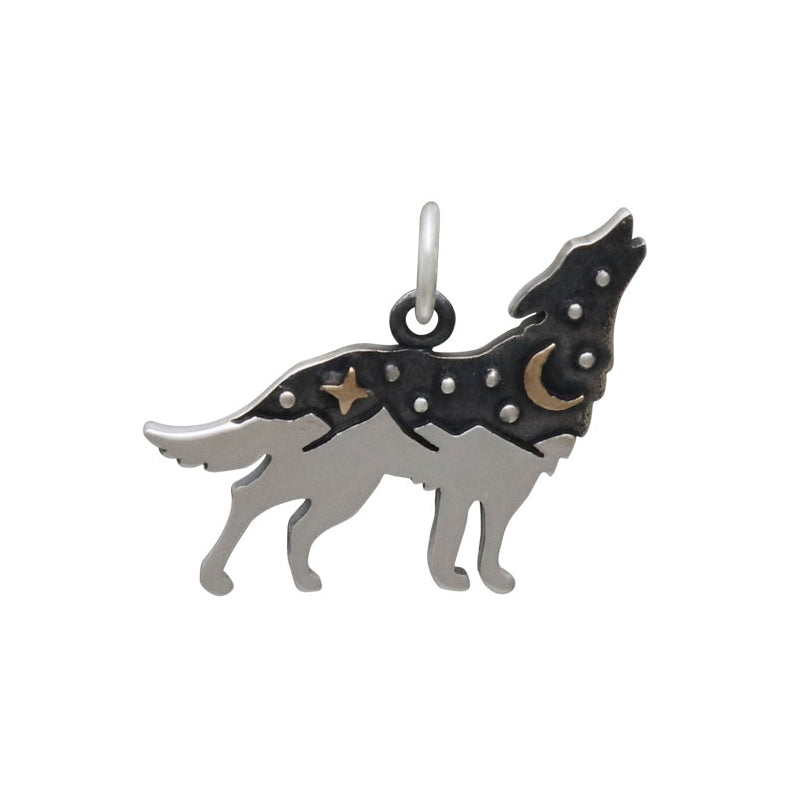 Sterling silver wolf charm with bronze star and moon enchants with its magical, mystical dreamscape - perhaps even transporting you to an unfamiliar place of trance walking and ritual dances. Because of their fierce spirit & success as hunters, wolves are about survival and loyalty to their pack. Every wolf instinctually does its part to help the whole.