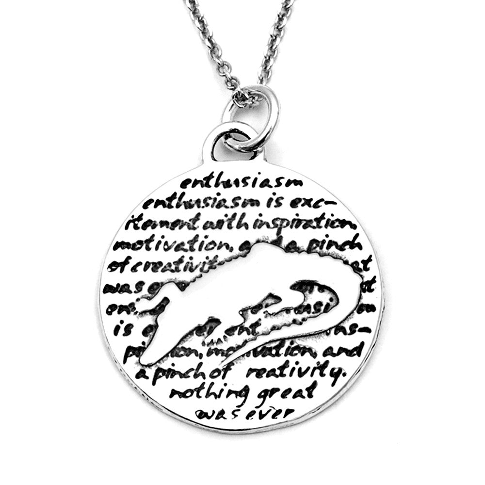 This round, reversible pendant features an alligator and reads: enthusiasm is excitement with inspiration, motivation, and a pinch of creativity. nothing great was ever achieved without enthusiasm.
