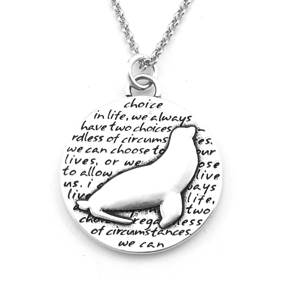 This round, reversible pendant features a sea lion and reads: in life, we always have two choices regardless of circumstances. we can choose to live our lives, or we can choose to allow our lives to live us. i choose to always live my life.