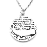 This round, reversible pendant features a whale and reads: life is a journey, with problems to solve, lessons to learn, but most of all, experiences to enjoy. the journey of a thousand miles begins with a single step. The beautiful journey of today, can only begin when we learn to let go of yesterday.