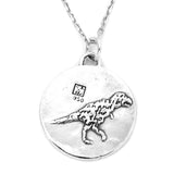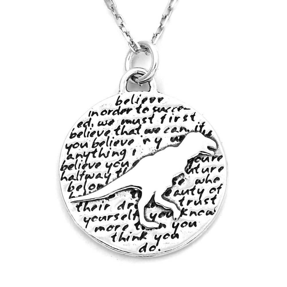 This round, reversible pendant features a dinosaur and reads: in order to succeed, we must first believe that we can. if you believe in yourself anything is possible. believe you can and you're halfway there. the future belongs to those who believe in the beauty of their dreams. trust yourself. you know more than you think you do.
