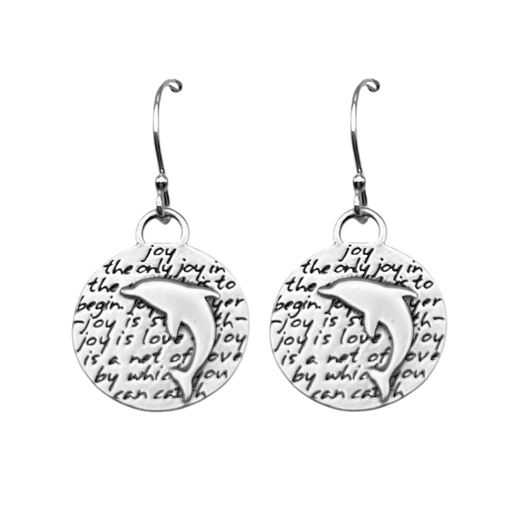 This round, reversible pendant features a dolphin and reads: the only joy in the world is to begin. joy is prayer - joy is strength - joy is love - joy is a net of love by which you can catch souls.