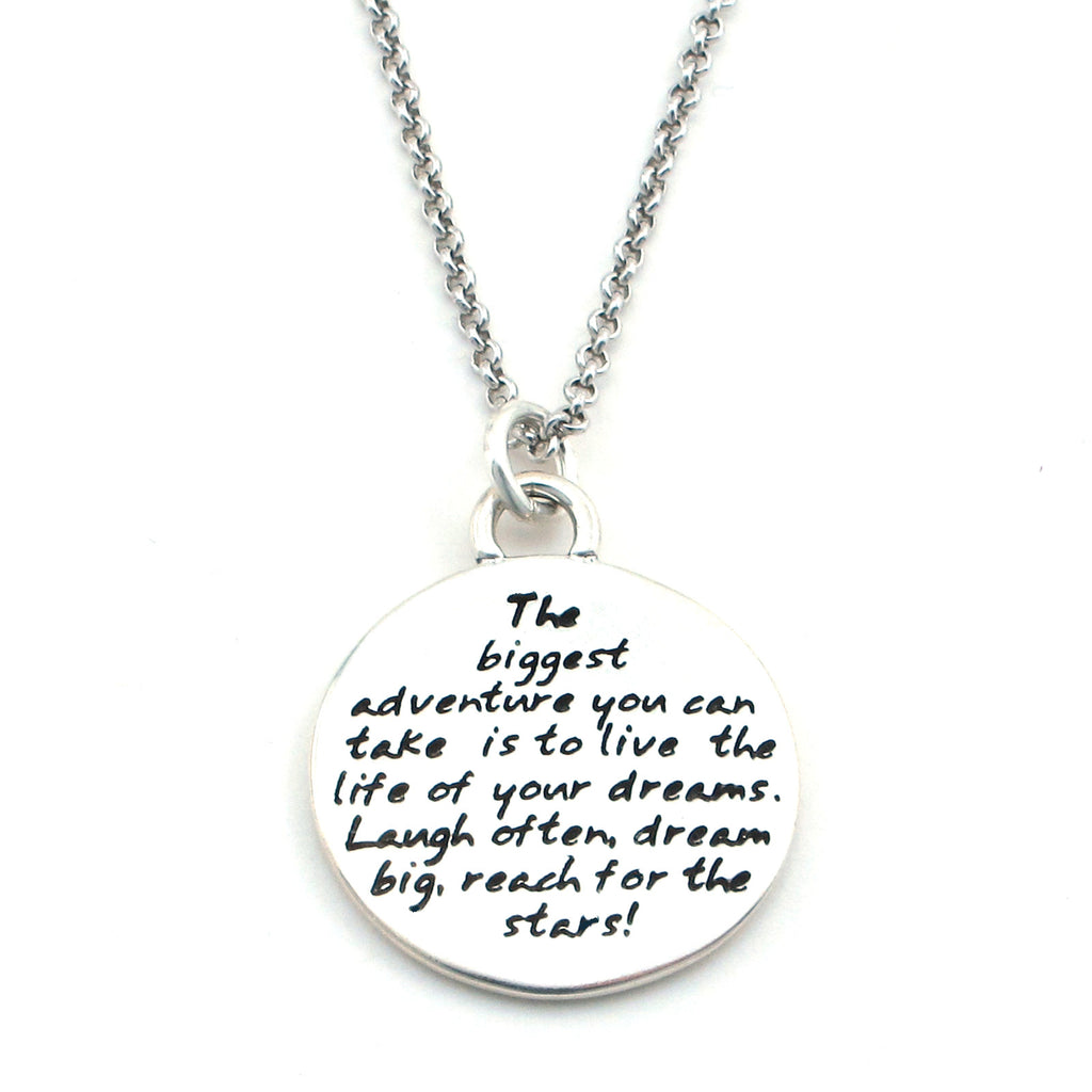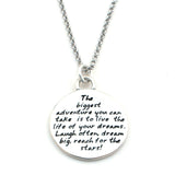 This round, reversible pendant features a dream braille and reads: The biggest adventure you can take is to live the life of your dreams. Laugh often, dream big, reach for the stars!