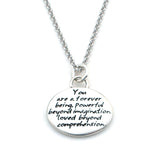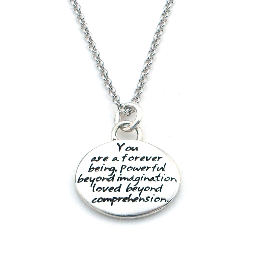 This oval, reversible pendant features an eternal braille and reads: You are a forever being, powerful beyond imagination, loved beyond comprehension.