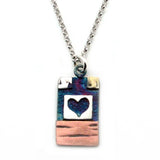 A sweet simple design speaks columns on the polished pendant from multi color patinated sterling silver, bronze and copper.