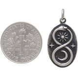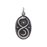 This silver infinity snake pendant with sun and moon draws you in and reminds us all of the cycles of endless returns in life. The infinity snake eating its own tail - speaks to the cyclic nature of the universe; that creation begins after destruction, and life springs forth from death. It is humanity's story and our place within it. A powerful symbol of endless return, the ouroboros gives us all hope. Carry this powerful charm in your jewelry collection as a reminder that life is a never-ending story.