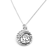 This round, reversible pendant features a ladybug and reads: it's believed she first came to earth by lightning, sent by the goddess of love and beauty. your presence is a gift to the world.