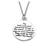 This round, reversible pendant features love braille and reads: The best and most beautiful things in the world cannot be seen or even touched. They must be felt with the heart.