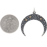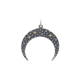 This sterling silver moon pendant with bronze stars and granulation is rich in details you'll ooh & aah over. This inverted crescent moon is oxidized black and dotted with silver granulation stars and little bronze stars. The contrast in colors between the metals is gorgeous, and its generous size makes this pendant perfect for necklaces and statement earrings.
