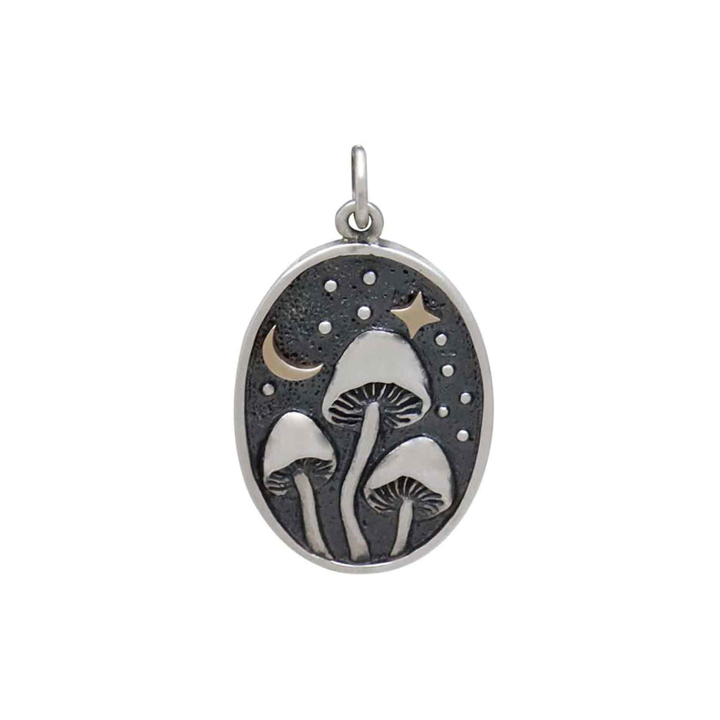 In this sterling silver mushroom pendant with bronze star and moon, we hope to transport you and your customers into a magical realm where fairies dance, witches, cast spells, and gnomes misbehave.
