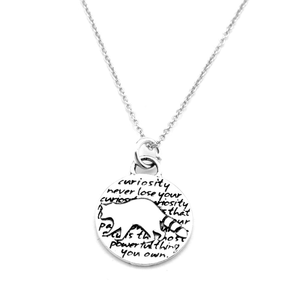 This round, reversible pendant features a raccoon and reads: never lose your curiosity. curiosity is the compass that leads us to our passions. curiosity is the most powerful thing you own.