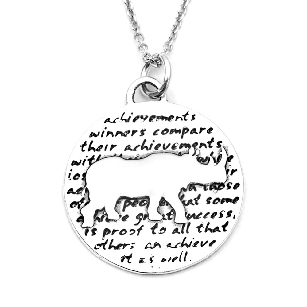 This round, reversible pendant features a rhino and reads: winners compare their achievements with their goals, while losers compare their achievements with those of other people. that some achieve great success, is proof to all that others can achieve it as well.
