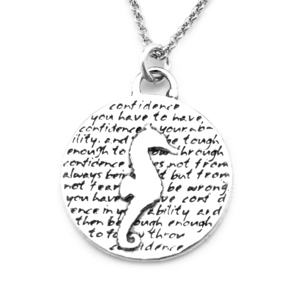 This round, reversible pendant features a seahorse and reads: you have to have confidence in your ability, and then be tough enough to follow through. confidence comes not from always being right but from not fearing to be wrong.