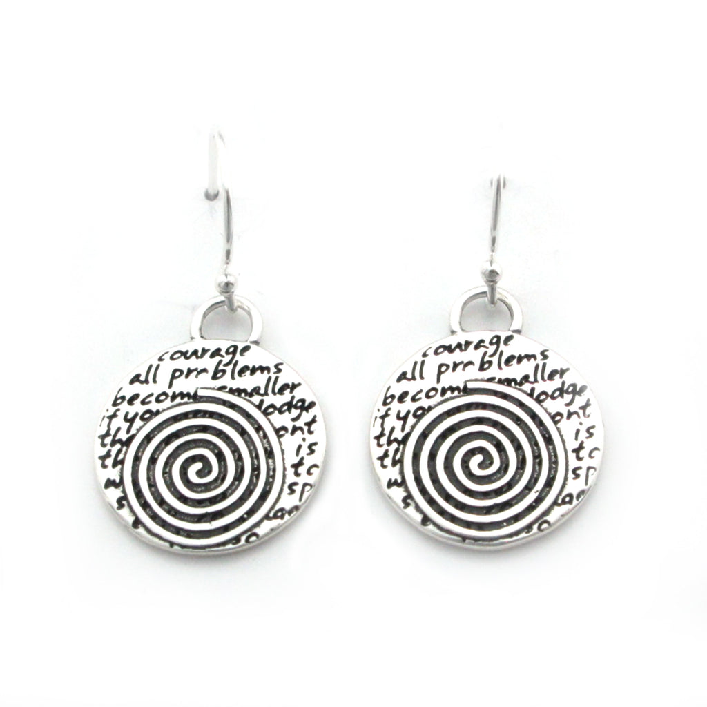 This round, reversible pendant features a spiral and reads: all problems become smaller if you don't dodge them, but confront them. courage is what it takes to stand up and speak; courage is also what it takes to sit down and listen.
