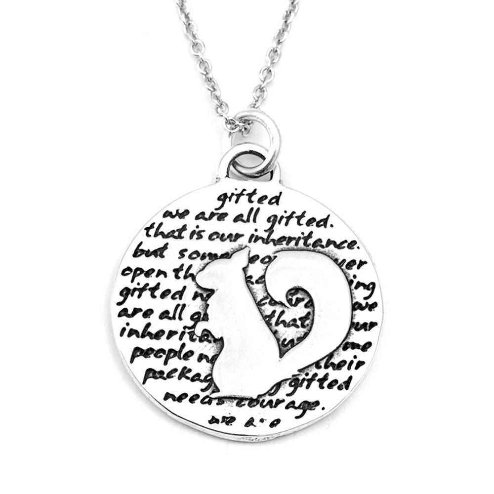 This round, reversible pendant features a squirrel and reads: we are all gifted. that is our inheritance. but some people never open their package being gifted needs courage.