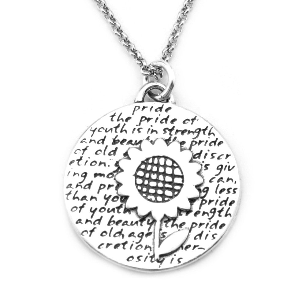 This round, reversible pendant features a sunflower and reads: the pride of youth is in strength and beauty, the pride of old age is in discretion. generosity is giving more than you can, and pride is taking less than you need.