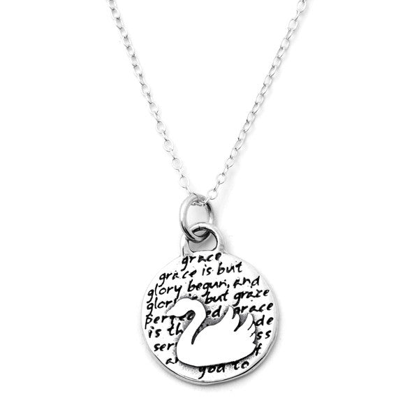 This round, reversible pendant features a swan and reads: grace is but glory begun, and glory is but grace perfected. grace is the free, undeserved goodness and favor of god to mankind. all grace grows as Love to the word of god grows.