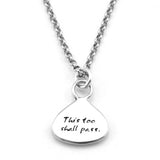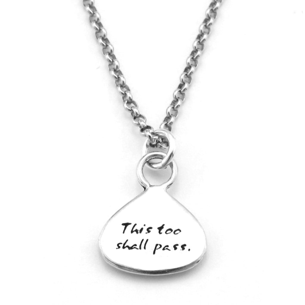 This kisses chocolate-shaped, reversible pendant features a time braille and reads: This too shall pass.