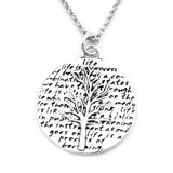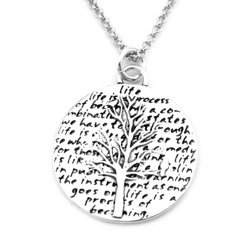 This round, reversible pendant features a tree and reads: life is a process of becoming, a combination of states we have to go through. life is a tragedy for those who feel, and a comedy for those who think. life is like playing a violin in public and learning the instrument as one goes on.