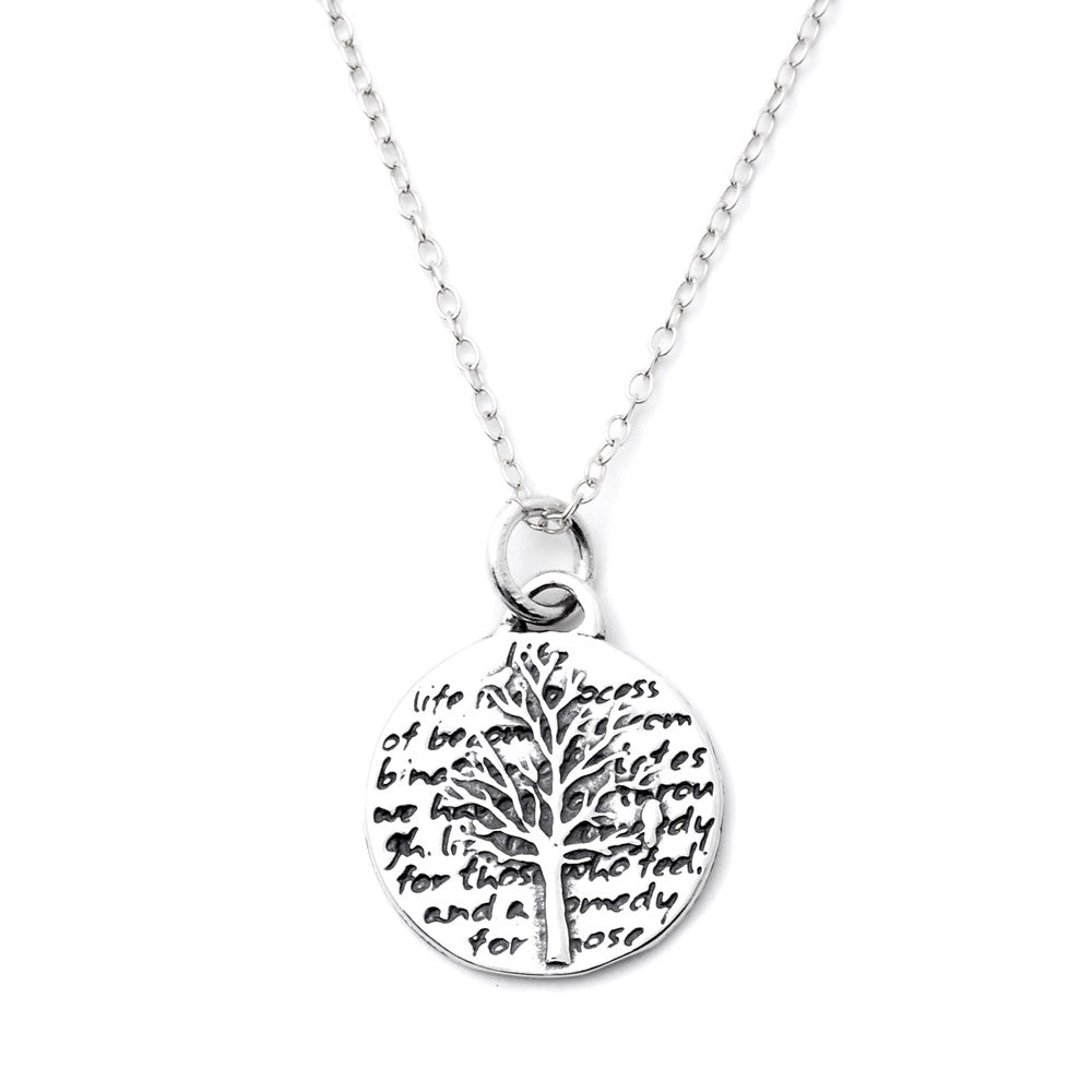 This round, reversible pendant features a tree and reads: life is a process of becoming, a combination of states we have to go through. life is a tragedy for those who feel, and a comedy for those who think.