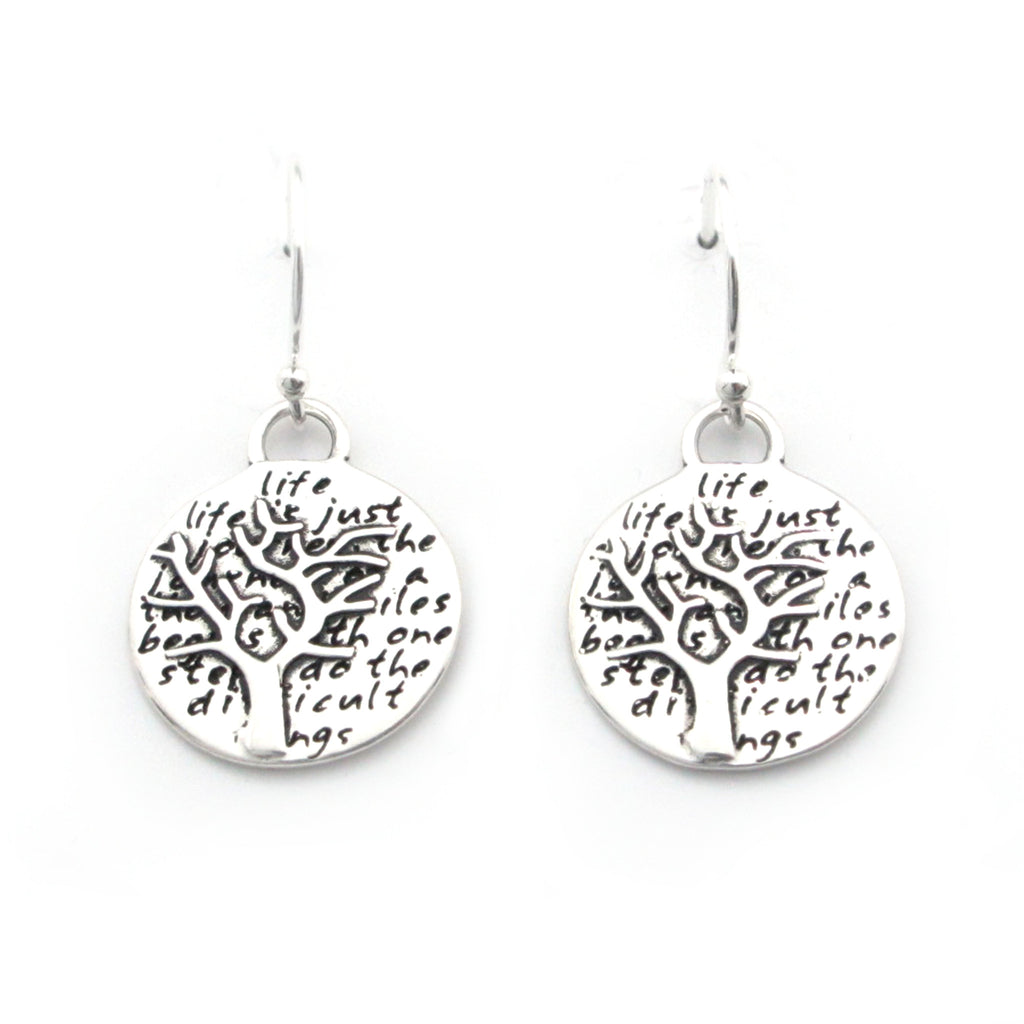 This round, reversible pendant features a tree and reads: life is just a journey. the journey of a thousand miles begins with one step. do the difficult things while they are easy and do the great things while they are small.