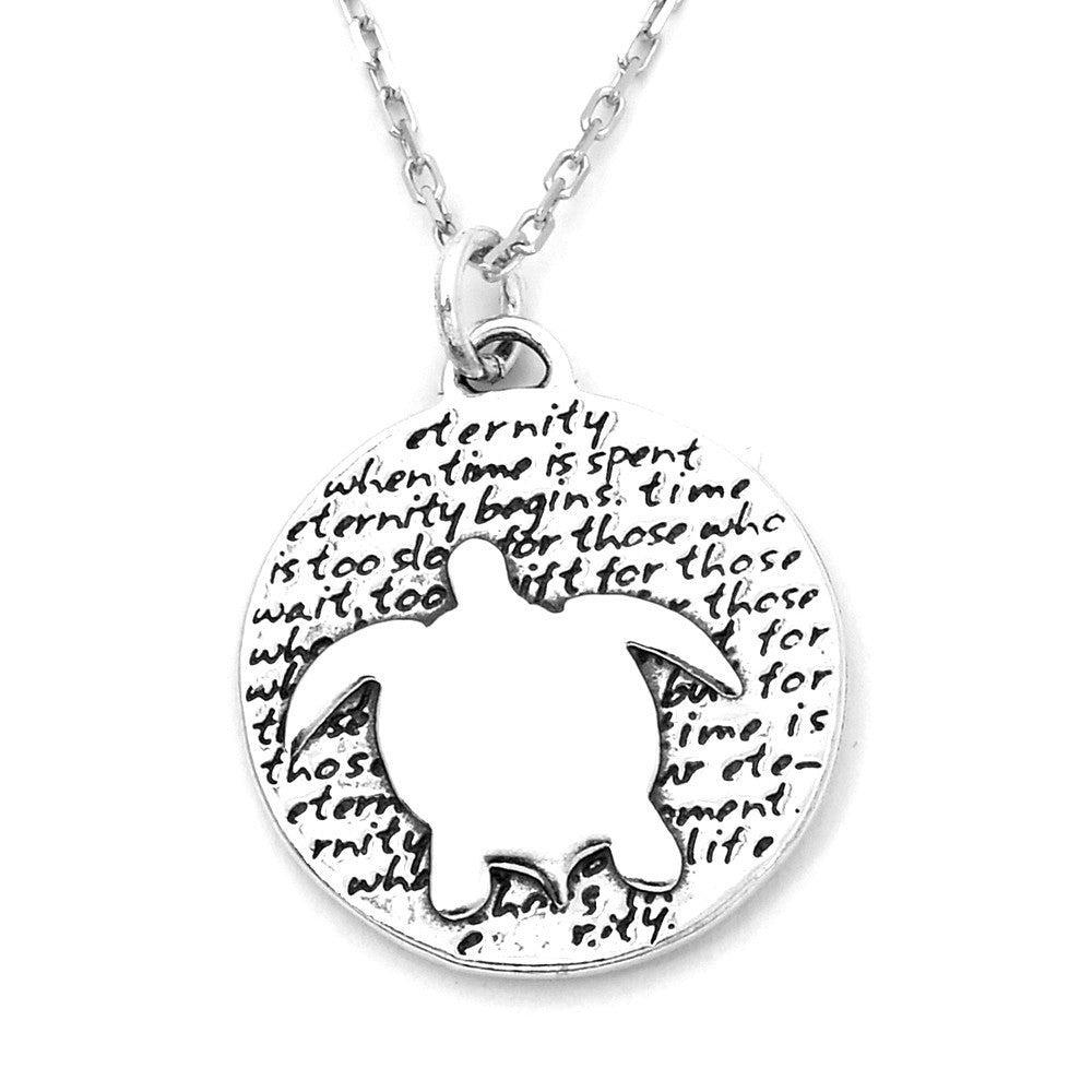 This round, reversible pendant features a turtle and reads: when time is spent eternity begins. time is too slow for those who wait, too swift for those who fear, too long for those who grieve, too short for those who rejoice, but for those who love, time is eternity. find your eternity in each moment. what we do in life echoes in eternity.