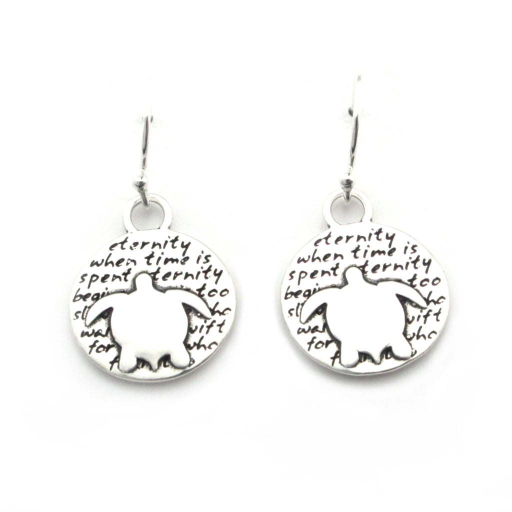 This round, reversible pendant features a turtle and reads: when time is spent eternity begins. time is too slow for those who wait, too swift for those who fear, too long for those who grieve, too short for those who rejoice, but for those who love, time is eternity.