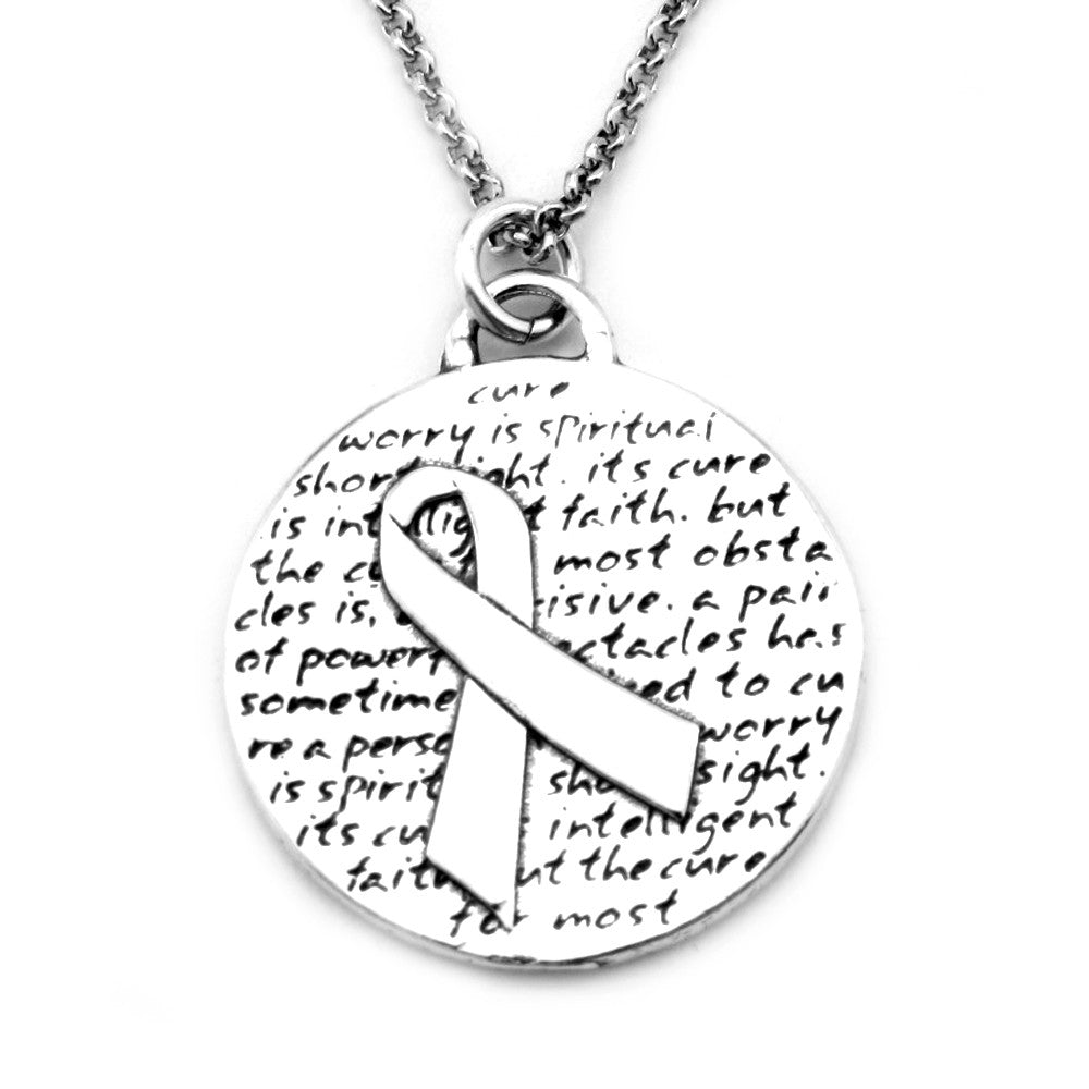 This round, reversible pendant features a ribbon and reads: worry is spiritual short sight. its cure is intelligent faith. but the cure for most obstacles is, be decisive. a pair of powerful spectacles has sometimes sufficed to cure a person in love.