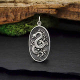 This oval framed sterling silver flower and snake pendant feature a coiled snake embellished with flowers & leaves, evoking a macabre still-life that will add instant Gothic appeal to your jewelry line.