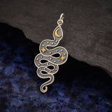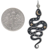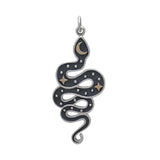 Allow this silver snake pendant with bronze moon and stars guide you through the darkest of nights. Rimmed with a silver frame, studded stars, and crowned with a slender crescent moon, use this beguiling snake in your jewelry line as an amulet of protection.