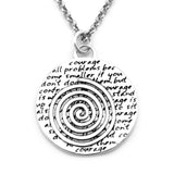 This round, reversible pendant features a spiral and reads: all problems become smaller if you don't dodge them, but confront them. courage is what it takes to stand up and speak; courage is also what it takes to sit down and listen.