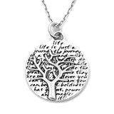 This round, reversible pendant features a tree and reads: life is just a journey. the journey of a thousand miles begins with one step. do the difficult things while they are easy and do the great things while they are small. whatever you can do or dream you can, begin it. boldness has genius, power and magic in it.