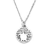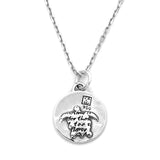 This round, reversible pendant features a turtle and reads: when time is spent eternity begins. time is too slow for those who wait, too swift for those who fear, too long for those who grieve, too short for those who rejoice, but for those who love, time is eternity.